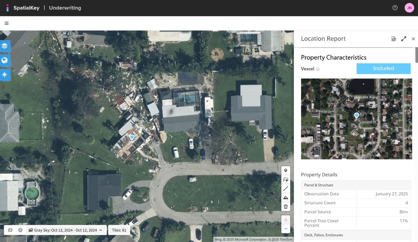 SpatialKey now integrates AI-derived property data and high-resolution imagery from Vexcel, giving underwriters unprecedented visibility into roof quality, building attributes, and hazard proximity. Whether evaluating a property before binding or assessing post-event damage, insurers can act faster and more accurately than ever.